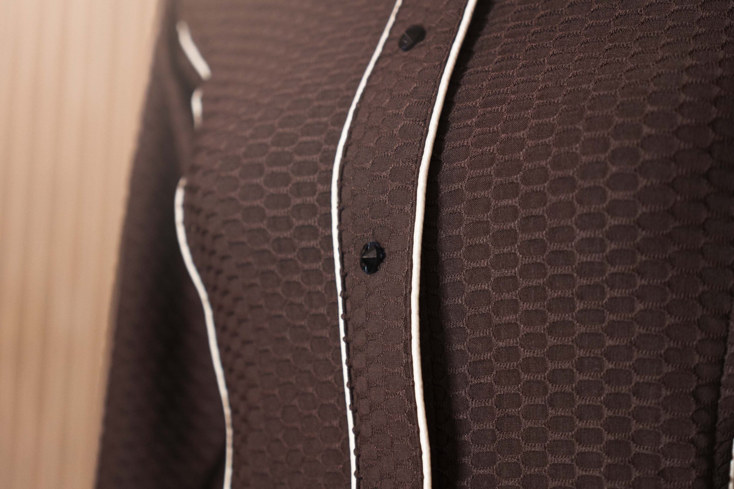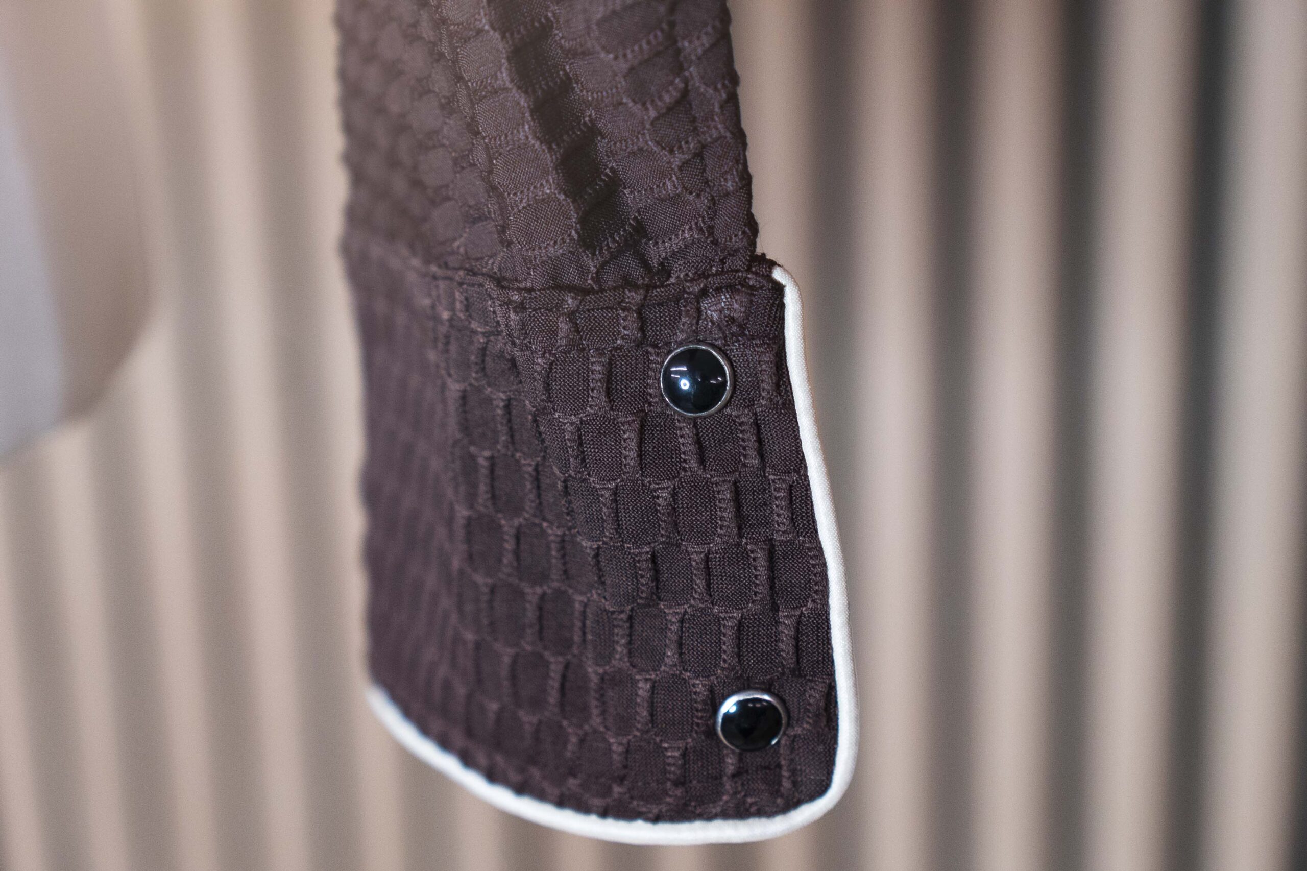 Bei diesem Modell wurden der Kragen, die Handgelenke, der Reisverschluss und zusätzlich zwei Wiener Nähte mit einer hellbeigen Paspel abgesetzt, wodurch die Figur nochmals schöner umschmeichelt wird.